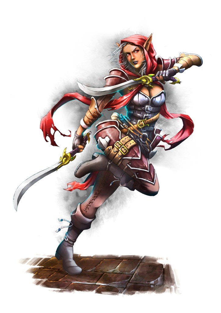 1 habilidad a elegir entre (“Arma a 2 manos”, “Arma y escudo” o “2 armas”), Esquiva, Asesinato, Gimnasia, Sigilo, Esprint y Engaño