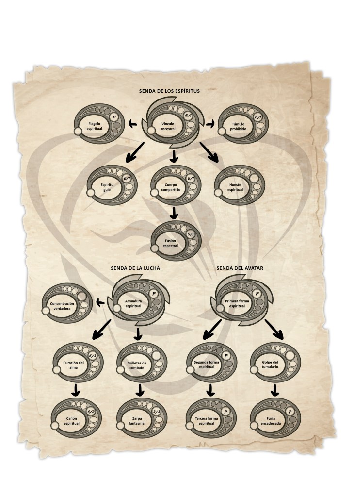 - Vínculo ancestral: Vincula a un espíritu que potencia al personaje y sus aliados en función del atributo escogido.